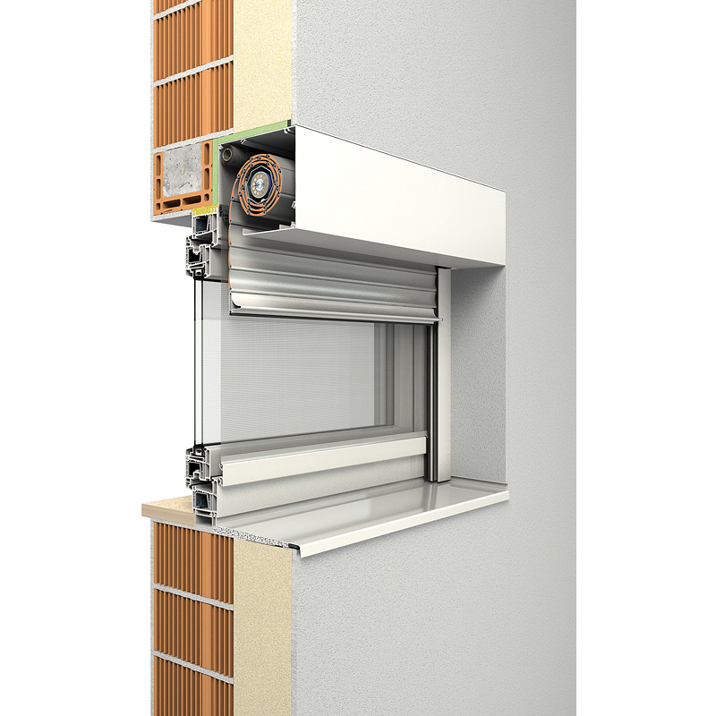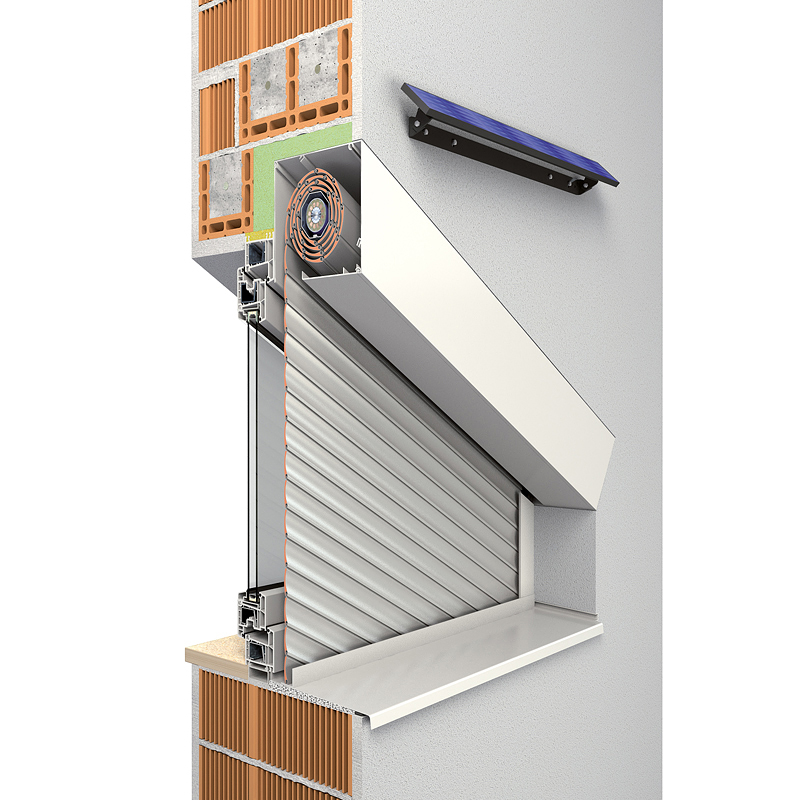 Das Rollladensystem passt sich in die Fassade ein und kann wahlweise mit eckiger oder fünfeckiger Frontblende verwendet werden.